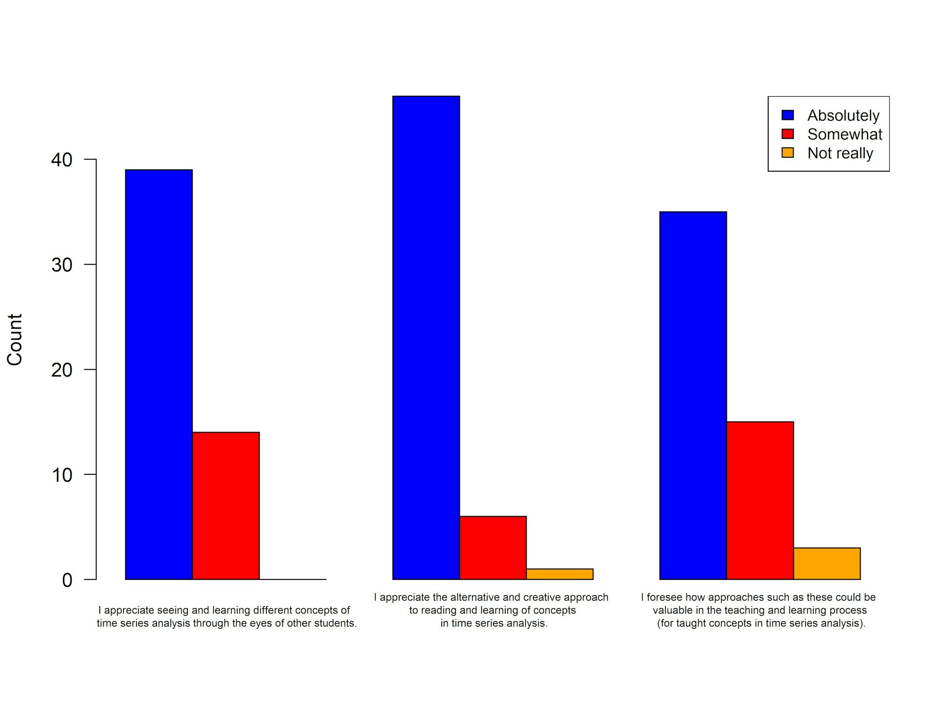 In 2024, shortly after the book was published, we asked students in the time series analysis course of that year to read any one of four stories (related to concepts that were already covered in the course material at that point in time). We asked them to complete a short and informal survey to gauge their experience and insights regarding the potential of this book as a learning resource for them.